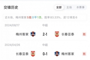 本场比赛之前,长春亚泰对阵梅州客家遭遇5连败。在2024赛季中超联赛中,亚泰客场1-2不敌梅州客家、主场0-1输给梅州客家。在2023赛季中超联赛中,亚泰主客场均2-4不敌梅州客家。在2022赛季中超联赛中,长春亚泰客场0-1不敌梅州客家。