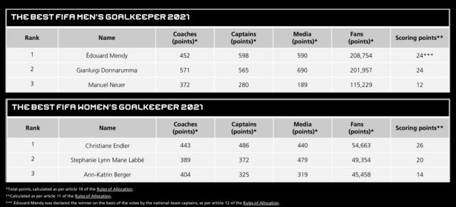最佳门将评选方面,爱德华·门迪与唐纳鲁马经过计算后的总分都是24分。这样的结果也表明,两人在4个投票主体中分别拿到两个第一和两个第二。根据相应规则,当出现平分时,应当以和对应奖项相关度最强的投票主体的投票结果为准。若最佳门将的评选出现平分情况,则以国家队队长的投票排定次序。因此在队长评分中以598比565险胜唐纳鲁马的门迪,在未入选年度最佳阵容的情况下,成为了2021年的年度最佳门将。