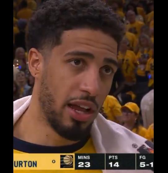 赛后在接受场边采访时,带伤出战的哈利伯顿表示:“我们想捍卫我们的主场,我不想看到这些家伙在我们主场庆祝夺冠。我们就是做出回应,非常棒的团队努力度,我为这个团队感到骄傲。”