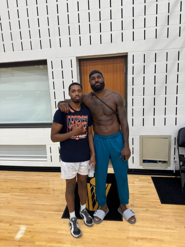 7月5日讯 据媒体The Ball Out爆料,湖人前锋詹姆斯今天出现在骑士训练馆内,并与骑士夏季联赛球队新秀丹佛-琼斯合影留念。